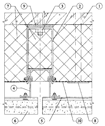Рис. 1.3. Фасад жилого дома на Ленинградском проспекте, 52 в г. Москве Облицовка плитами керамогранита 3.2. Кронштейны (рис. 3.1) крепятся к основанию дюбелями через паронитовую прокладку толщиной 6 мм. Различаются два вида кронштейнов: основные и промежуточные. Основные кронштейны воспринимают как горизонтальные так и вертикальные нагрузки, промежуточные - рассчитаны, в основном, на горизонтальные усилия. 3.3. Вертикальный промежуточный профиль (рис. 3.2) присоединяется к кронштейнам болтами или заклепками. Конструкция узла соединения промежуточного профиля с кронштейном в определенных пределах позволяет изменить расстояние от основания до вертикального профиля, благодаря чему можно применять утеплитель разной толщины и компенсировать отклонения основания от плоскости, кроме того, это расстояние можно регулировать за счет применения кронштейнов и вертикальных профилей с разной высотой сечения. Как правило, верхняя часть профиля жестко фиксируется на основном кронштейне, а средняя и нижняя части крепятся таким образом, чтобы иметь возможность перемещаться в вертикальном направлении под действием температурных деформаций. Средняя часть профиля (по необходимости) крепится к промежуточному кронштейну, а нижняя - к основному. Стыковка профилей выполняется на основных кронштейнах с учетом зазора для компенсации температурных деформаций. 3.4. Минераловатные плиты утеплителя устанавливают по всей поверхности стены, в том числе в кронштейны и вертикальные профили и крепят к стене (основанию) дюбелями. Оконные и другие проемы по периметру обрамляются полосами шириной 200 мм минераловатного утеплителя плотностью не менее 70 кг/м3. Если проектом предусмотрена установка гидроветрозащитной паропроницаемой пленки, минераловатные плиты вначале крепят двумя дюбелями, а после установки всех плит раскатывают полотно пленки и крепят вместе с минераловатными плитами еще тремя дюбелями каждую плиту. 3.5. Горизонтальные несущие профили крепятся к вертикальным промежуточным профилям болтами или заклепками. Стыковка несущих профилей производится на вертикальном промежуточном профиле с учетом зазоров для компенсации температурных деформаций. 3.6. Для облицовки фасада применяются плиты из натурального камня, керамогранита, стеклофибробетона, прессованной бетонной смеси с фактурой под мрамор. Для крепления облицовочных плит из натурального камня и из искусственных материалов применяют различные типы горизонтальных несущих профилей (рис. 3.3 и 3.4). Плиты из натурального камня крепятся на фасаде при помощи имеющихся на верхней и нижней грани, сквозных пазов, в которые вставляются выступы горизонтального несущего профиля. Плиты из керамогранита и других искусственных материалов фиксируют кляммерами из нержавеющей стали, которые продевают в горизонтальный профиль и крепят к нему саморезами на углах облицовочных плит с отступом от их края не менее 5 мм. 3.7. Облицовка оконных и дверных откосов, а также углов здания производится при помощи алюминиевых уголков, которые крепятся к горизонтальным несущим профилям болтами или заклепками. В плоскости откоса к уголку крепятся элементы несущего профиля длиной равной ширине откоса, на которые устанавливаются соответствующего размера облицовочные плиты (рис. 3.5, 3.6, 3.7). Рис. 3.1. Кронштейн основной и п