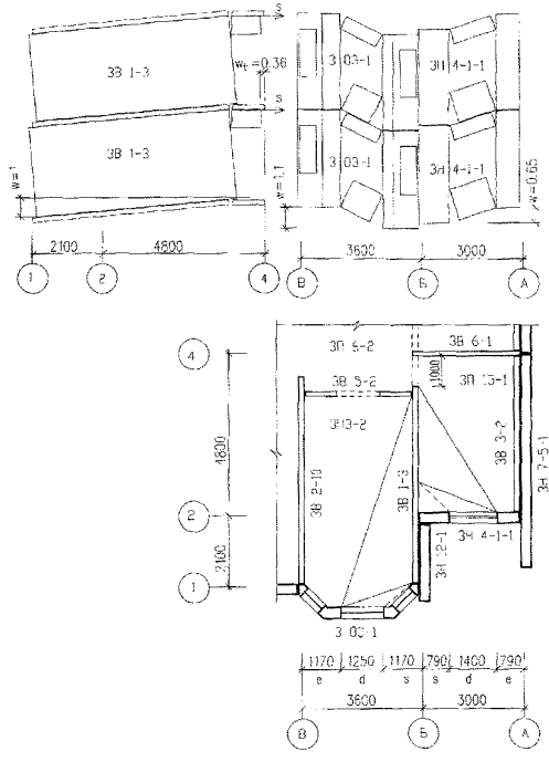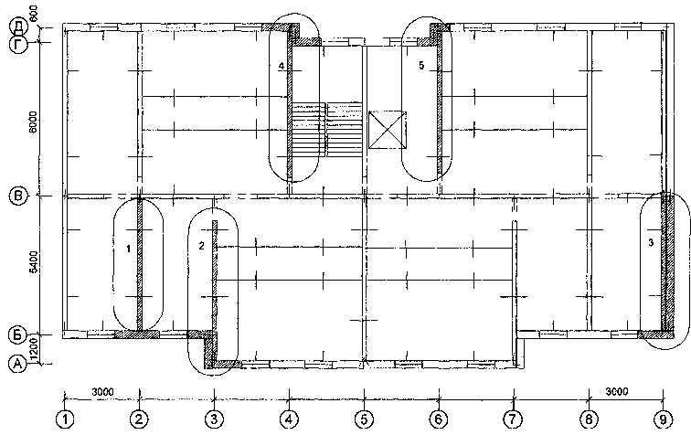 Нормативные нагрузки на перекрытия: постоянная нагрузка g=3,85 кН/м2 длительная часть временной нагрузки ql=0,3 кН/м2. Всего q=(g + ql)=4,15 кН/м2. Нормативная нагрузка на лоджии ql=0,3 кН/м2 Расчет производится по Приложению 1. Несущие способности элементов определяют по СНиП 2.03.01- 84*. Наиболее опасные случаи расположения гипотетических локальных разрушений на плане здания в соответствии с п. 7 показаны на рис. 11. Здесь для примера рассмотрены схемы разрушений №1 - № 4. Рис. 11 Фрагмент жилого дома ПЗМ. 2. Расчет несущей способности отдельных сечений конструктивных элементов. 2.1. Панели наружных стен. Расчетное сопротивление материалов определяют по указаниям п. 3 Приложения 1. Бетон: Rb=Rbngb2gb3/gb=11´1,25´1,15/1,15=13,75; Rbt=Rbt,ngb2gb3/gbt=1,15 х 1,25 s 1,15 /1,25=1,44 МПа Арматура Æ8 мм класса A-111 Rs= 390´1,1/1,05=408 МПа. Несущая способность по изгибу верхней и нижних (под окном и под дверным проемом) перемычек определяется по СНиП 2.03.01-84*. Проверка невозможности хрупкого разрушения элементов наружной панели производится в соответствии с требованиями п. 51. Условие прочности выполняется. Несущая способность по изгибу простенков заведомо больше, чем перемычек. Проверка прочности простенков по поперечной силе дает удовлетворительные результаты1. Предельные изгибающие моменты, действующие в угловых шарнирах рамы наружных панелей принимаются из расчета перемычек по изгибу и представлены в таблице 2. 1Численная реализация расчета здесь не приводится 2.2. Внутренние стены Расчетное сопротивление материалов: Бетон: Rb=20,9 МПа; Арматура Æ10 А-111 Rs= 408 Мпа, Æ5 BI Rs= 408 Мпа. Несущая способность по изгибу надпроемных перемычек приведена в таблице 2. Несущая способность перемычек стеновых панелей Таблица 2.