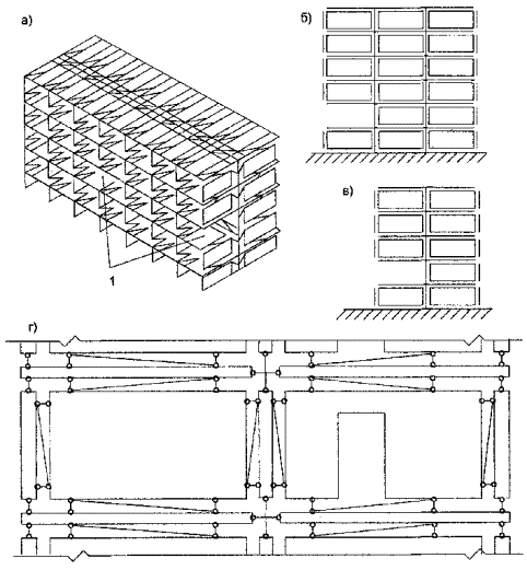 Расчетные сопротивления прокатной стали принимаются по СНиП II-23-81* с учетом допустимости работы пластичных сталей за пределом текучести. Коэффициент условий работы для пластичных сталей принимается равным 1,1. 2.5. Для расчета панельных зданий на устойчивость против прогрессирующего обрушения рекомендуется использовать пространственную расчетную модель в виде системы пластинок (с проемами или без проемов), соединенных между собой сосредоточенными связями, прочность которых эквивалентна прочности фактических связей между панелями (рис. 2а). Такая модель должна включать элементы, которые при нормальных эксплуатационных условиях являются ненесущими, а при наличии локальных разрушений активно участвуют в перераспределении нагрузки: наружные навесные панели, монтажные связи и т.п. Модель здания должна быть рассчитана при всех выбранных в соответствии с рекомендациями п. 2.3 расчетных схемах локального разрушения конструкций. Рис. 2. Расчетная модель здания с локальными разрушениями 1 - локальные разрушения 2.6. В случае обеспечения пластичной работы конструктивной системы в предельном состоянии расчет рекомендуется проводить кинематическим методом теории предельного равновесия. В этом случае допускается проверять устойчивость лишь элементов, расположенных над локальным разрушением, и расчет здания при каждой выбранной схеме локального разрушения сводится к следующей процедуре: задаются наиболее вероятные механизмы прогрессирующего (вторичного) обрушения элементов здания, потерявших опору (задать механизм разрушения значит определить все разрушаемые связи и найти возможные обобщенные перемещения (wi) по направлению усилий в этих связях); для каждого из выбранных механизмов прогрессирующего обрушения определяются прочности всех пластично разрушаемых связей (Si), находятся равнодействующие внешних сил, приложенных к отдельным звеньям механизма, то есть к отдельным неразрушаемым элементам или их частям (Gi), и перемещения по направлению их действия (ui); определяются работы внутренних сил (W) и внешних нагрузок (U) на возможных перемещениях рассматриваемого механизма