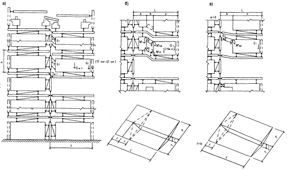 весом наружных панелей, примыкающих к поврежденной стене слева и справа ( Выполнение требования (4) является необходимым условием предотвращения прогрессирующего обрушения здания, при сравнительно небольших перемещениях (менее 10 см) конструкций, потерявших опору. Если оно выполнено, следует перейти к проверке дополнительных условий, изложенных в пп. 3 - 5. Если же условие (4) не соблюдается, возможны два варианта: первый - усилением (или перераспределением) арматуры перемычек внутренних стен и плит перекрытий добиться его выполнения; второй - перейти к другим конструктивным способам защиты от прогрессирующего обрушения, допускающим очень большие перемещения (десятки сантиметров) элементов, потерявших опору и требующих соответственно выполнять расчет по деформированной схеме (см. п. 6). 3. Механизм прогрессирующего обрушения второго типа характеризуется одновременным поворотом каждой стеновой панели, расположенной над локальным разрушением, вокруг своего центра вращения (рис. 5). Такое смещение требует разрушения растянутых связей этих панелей с неповрежденной стеной (S2 на рис. 5а), разрушения связей сдвига стеновых панелей с плитами перекрытий в горизонтальных стыках (S3 на рис. 5) и пластического излома плит перекрытий, первоначально опертых по трем сторонам, по схеме, приведенной на рис. 5, г. В рассматриваемом случае условие (2) принимает вид где где y2, h, x - расстояния от центра вращения до линии действия усилий S2 и S3 и силы тяжести Gw,in (см. рис. 5);