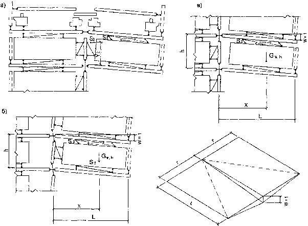 2. Первый механизм прогрессирующего обрушения характеризуется одновременным поступательным смещением вниз всех стеновых панелей (или отдельных их частей), расположенных над локальным разрушением (рис. 4). Такое смещение возможно при разрушении связей сдвига между продольными и поперечными стенами (рис. 4,а) или при разрушении надпроемных перемычек и плит перекрытий (рис. 4,б,в). При оценке возможности одновременного обрушения конструкций всех этажей условие равновесия (1) заменяется условием где Wf и Uf - соответственно работа внутренних и внешних сил на перемещениях элементов одного этажа; этажи разделяются нижней поверхностью перекрытия, которое относится к этажу, расположенному над перекрытием. Если плиты перекрытий не заведены в продольные несущие стены, обрушению препятствуют лишь связи сдвига между панелями разрушенной поперечной стены и продольной стены (рис. 4,а). В этом случае условие равновесия (2) эквивалентно требованию