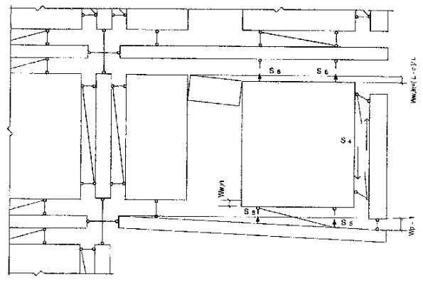 же смысл, что и в формуле (9); величина Выполнения условия (12) следует добиваться прежде всего за счет увеличения связей сдвига (S3) так как увеличение прочности растянутой связи (S2) не всегда возможно (рис. 5,б), а иногда и нецелесообразно: если к продольной стене прикрепляется поперечная стена лишь с одной стороны, то для учета этой связи в расчете необходимо оценить прочность продольной стены на изгиб из ее плоскости (см. рис. 5,в). 4. Помимо условий необрушения (4) и (12) необходимо оценить возможность обрушения лишь одних плит перекрытий, расположенных непосредственно над выбитой панелью поперечной стены и первоначально опертых по трем сторонам (третий механизм). Для того, чтобы эти плиты не обрушивались, достаточно выполнить условие где S4, - прочность сдвиговой связи между навесной панелью и поперечной стеной (рис. 6); в формуле (16) S4 принимается по расчету, но не более величины Uw,ex Если соотношение (16) не выполняется, это значит, что плиты необходимо прикрепить к вышерасположенной поперечной стене связями, воспринимающими растяжение (рис. 6). Тогда условие (16) заменяется следующим: где