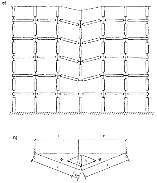 (16) не выполняется ( 5. Четвертый механизм обрушения предусматривает перемещения конструкций лишь одного этажа, расположенного непосредственно над выбитой панелью поперечной стены (рис. 7). Этот механизм предполагает сочетание поступательного перемещения поперечной стены (как в первом механизме) с изломом плит, характерным для второго механизма (см. рис. 5,в, г). Такой механизм возможен лишь при ослаблении поперечной стены дверными или оконными проемами. Условие невозможности образования механизма рассматриваемого типа где где k - число связей шестого типа; S6, S5 - предельные усилия в связях шестого и пятого типа; w, - перемещения по направлению 1-й связи пятого типа, они определяются как разность перемещений точки прикрепления связи к плите и точки прикрепления связи к панели поперечной стены. Если при отсутствии связей шестого типа (S6=0) условие (19) не выполняется, не рекомендуется добиваться его выполнения за счет усиления связей пятого типа - это неэкономично, поскольку эти связи, как следует из уравнения (20), работают неравномерно. В этом случае наиболее рациональное решение - поставить связи шестого типа и образовать междуэтажные связи. 6. Если при локальном разрушении внутренней поперечной стены не удается обеспечить выполнение условия (4), то есть не удается предотвратить прогрессирующее обрушение по первой схеме (см. рис. 4), рекомендуется специальными связями плит перекрытий обеспечить их эффективное сопротивление прогрессирующему обрушению при больших прогибах как элементов висячей системы (рис. 8). Такой прием обычно оказывается целесообразен и необходим при локальном разрушении поперечной стены, значительно удаленной от остальных несущих стен и связанной с ними только балочными плитами перекрытий или слабоармированными большепролетными плитами, первоначально опертыми по трем сторонам. Рис. 7. Схема обрушения конструкций одного этажа Рис. 8. Работа плит перекрытий как элементов висячей системы Требования, которым должны удовлетворять связи и плиты, образующие висячую систему, вытекают из расчета по деформированной схеме (см. рис. 8,б): цепь последовательно соединенных элементов (связь - плита - связь - плита - связь) должна включать очень пластичное звено, которое обеспечивало бы общее удлинение цепи порядка нескольких процентов (естественно, при этом в плитах допускаются какие угодно трещины). Для выполнения этого условия необходимо, чтобы