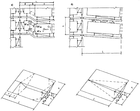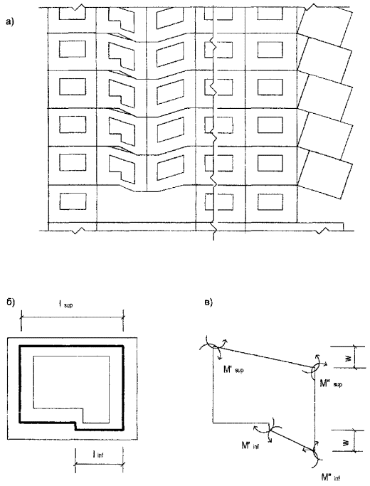 изгибающие моменты, действующие в угловых шарнирах (например, Рис. 9. Работа элементов наружных стен Рис. 10. Работа плит перекрытий в зданиях с железобетонными наружными стенами В случае локального разрушения поперечной стены, примыкающей к углу здания, панель наружной стены может разрушиться по схеме поворота жесткого диска (см. рис. 9,а); при этом работа внутренних сил будет определяться прочностью сдвиговой связи этой панели с вышележащим перекрытием (V) и растянутой связи с соседней фасадной панелью (S) Из двух возможных значений Ww,еx, определенных по формулам (23) и (24), в дальнейших расчетах учитывается меньшее. 9. Для учета сопротивления наружной стены прогрессирующему обрушению прежде всего необходимо убедиться в том, что она «несет сама себя», то есть проверить условие в котором работа внешних сил Uw,ex определяется по формуле (11). В тех случаях, когда условие (25) не выполняется (Rw.ex<0), весь дальнейший расчет проводится точно так же, как для зданий с продольными ненесущими стенами из легких небетонных материалов - по рекомендациям пп. 2÷5 с той лишь разницей, что во всех соотношениях работа Uw,ex заменяется величиной Rw,ех. Если же условие (25) выполняется, то дальнейший расчет определяется конструктивным решением сопряжения плит перекрытий и наружной продольной стены. Если плиты перекрытия не заведены в наружную стену, необходимо, чтобы прочность соединения внутренней панели поперечной стены и панелей наружных стен при их взаимном сдвиге (S4) удовлетворяла условию S4w³R. (26) В этом случае проверка возможности прогрессирующего обрушения проводится последовательно по рекомендациям пп. 8 - 11 со следующими незначительными изменениями: в соотношениях (4) и (12) работа Uw,ex заменяется величиной - Rw,ex в формулах (16), (17) принимается, что Uw,ex=S4ww,ex; в формуле (19) при этом принимается: Uw,ex-S4(ww,ex-ww,in)=-Rw,ex. Если плиты перекрытий заведены в наружную стену, то сдвиговая связь между внутренней поперечной и продольной наружной стенами может не ставиться (S4=0), и для оценки защиты здания от прогрессирующего обрушения проверяются лишь условия (4) и (12) при Uw,ex,i=-Rw,ex,i-Wp,bor,i, (27) где Wp,bor,i - дополнительная работа плит перекрытий, связанная с изломом их внешнего края, заведенного в наружную стену; эта работа зависит от типа рассматриваемого механизма прогрессирующего обрушения. Сопротивление внешнего края плиты перекрытия, заведенного в наружные стены, создает дополнительную работу внутренних сил, вычисляемую для механизма обрушения первого типа (см. рис. 10,а) для i-й плиты