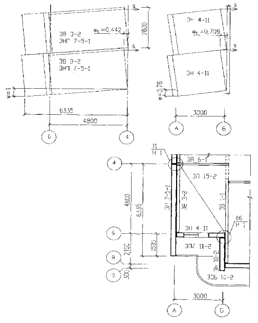 2.4 Несущая способность связей. В настоящее время практически во всех типовых проектах используются связи для восприятия монтажных нагрузок. Связь, представляющая собой цепочку: анкер первого элемента, заделанный в бетон; приварка анкера к пластине (штампованной) закладной детали; сварные швы, соединяющие накладку с закладной деталью; накладка; сварные швы, соединяющие накладку со второй закладной деталью; приварка анкеров к пластине этой закладной детали, анкер второго элемента. Анализ конструкции узлов выполнен по альбому «3НДС, часть III, Железобетонные конструкции надземной части здания. Детали узлов. М., 1996 г.» Монтажные накладки имеют сечение не менее 40×6 мм, несущая способность такой накладки по растяжению в расчетах на прогрессирующее обрушение N=62 кН. Приварка накладки осуществляется двумя сварными швами с катетом 6 мм, L=60 мм. Несущая способность швов до N=63,0 кН. Несущая способность анкеровки закладных деталей в бетоне для принятых конструктивных решений не превышает 36 кН. При этом приварка анкеров к штампованной пластине считается равнопрочной заделке анкеров. Таким образом, в рассматриваемой цепочке хрупкое разрушение (вырыв анкеров из бетона или разрушение сварных швов) наступает ранее, чем реализуется пластичность накладки, несущая способность связи S2=36 кН. 3. Проверка устойчивости здания при локальном разрушении его несущих конструкций по схеме № 1 (рис. 11). Рассматривается обрушение конструктивной ячейки в осях 4 - 8 и А - Б i-гo этажа. Первично разрушаются панели внутренней и наружной стены по оси А между осями 4 - 8 и панель наружной стены по оси 6. Проверяется невозможность обрушения зависших над локальным разрушением конструкций перекрытий и стеновых панелей. Поскольку плиты перекрытий заведены в стены, а внутренняя поперечная стена не имеет дверного проема, первый механизм обрушения невозможен (см. 8 Приложения 1). 3.1. Оценка возможности возникновения механизма прогрессирующего обрушения второго типа. Схема возможного разрушения конструкций представлена на рис. 12. Рис. 12 Схема № 1. Механизм обрушения второго типа. Прогрессирующему обрушению в данном случае сопротивляются на каждом этаже плита 3П 15-1; плита лоджии 3ПЛ 11-2 и объемный балкон 3БО 10-2; связи растяжения второго типа, соединяющие между собой внутренние поперечные стены, а также наружные стены в узле 11 / H1. Прочность связей в узле 11 / H1 принята равной S2= 36 кН. Наружные стеновые панели 3Н 4-11 и 3Н 7-5-1, а также внутренняя стеновая панель 3В 3-2 при рассматриваемой схеме не разрушаются, поэтому для них работа внутренних сил принята равной нулю. Прочность связи растяжения между наружной стеной 3Н 4-11 и внутренней 3В 1-1 считается нулевой, т.к. она ограничена прочностью стеновой панели при изгибе ее из плоскости. Проверка устойчивости конструкций против прогрессирующего обрушения производится в таблице 7, где работа внутренних и внешних сил плит перекрытий принята из таблиц 5 и 6, соответственно. Прочность наружных и внутренней стеновых панелей принята по таблице 2. Работа сил веса стеновых панелей определяется по формуле (11), веса элементов приняты по таблице 1. Работа внутренних сил плиты лоджии определена при величине перемещения wl=0,5×(1+0,76)/3,0; а объемного балкона - при wb=0,5/(3,0/2). Условие необрушения не выполняется. Рекомендуется увеличить прочность связей растяжения в узле