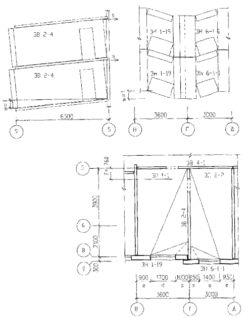 Примечание. В скобках указаны номера формул по Приложению 1. W< U Условие устойчивости нарушено 4. Проверка устойчивости здания при локальном разрушении его несущих конструкций по схеме № 2. Рассматривается обрушение конструктивной ячейки в осях 5 - 9 и В - Д (рис. 11) на i-м этаже здания. Первично разрушается панель внутренней стены по оси Г между осями 5 и 9 и примыкающие к ней два простенка наружных стен по оси 9. Проверяется невозможность обрушения зависших над этим локальным разрушением конструкций перекрытий и стеновых панелей. Прогрессирующему разрушению в данном случае сопротивляются на каждом этаже панель внутренней стены; плиты перекрытий слева и справа от оси Г; наружные стены. 4.1. Оценка возможности возникновения механизма прогрессирующего обрушения первого типа. Расчет производится в соответствии с пп. 9 - 15 настоящего Приложения. Схема возможного разрушения конструкций представлена на рис. 13. Проверка устойчивости конструкций против прогрессирующего обрушения производится в таблице 8, где работа внутренних Wр, и внешних Up сил плит перекрытий принята из таблиц 5 и таблиц 6, соответственно. Прочность перемычек наружных и внутренней стеновых панелей принята по таблице 2. Работа сил веса стеновых панелей определяется по формуле (11), веса элементов приняты по таблице 1. Условие устойчивости выполняется. Проверка условия устойчивости по схеме № 2 (рис. 13) Механизм прогрессирующего обрушения первого типа Таблица 8.