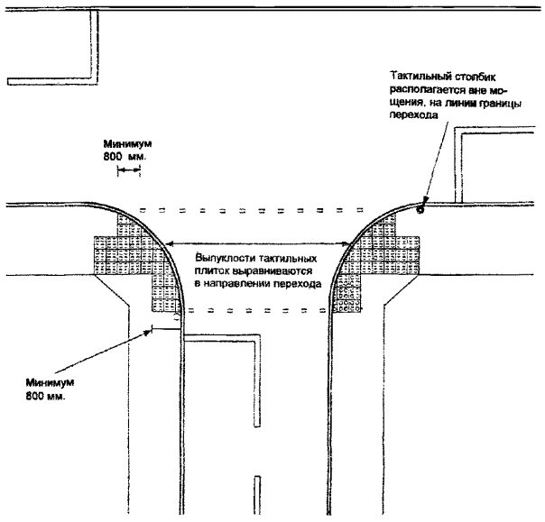 Примечание: Размеры даны в мм. 2.3. ПРИМЕРЫ МОЩЕНИЯ ПЕРЕХОДОВ ТАКТИЛЬНЫМИ ПЛИТАМИ2.3.1. КОНФИГУРАЦИЯ ПЛОЩАДИ МОЩЕНИЯ ТАКТИЛЬНЫМИ ПЛИТАМИ В ЗАВИСИМОСТИ ОТ МЕСТОПОЛОЖЕНИЯ ПЕРЕХОДА А. Г - ОБРАЗНАЯ КОНФИГУРАЦИЯ