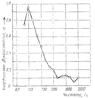 ТN - время реверберации в помещении на частоте 1000 Гц, с; f - среднегеометрическая частота полосы, Гц; V - объем помещения, м3. На частотах выше 6300 Гц постоянные 0,9 и 1,1 в формулах (8) следует заменять соответственно на 0,8 и 1,2. Время реверберации на частоте 1000 Гц ТN должно иметь значение от 0,5 до 1 с. Для корректировки времени реверберации в специальном реверберационном помещении на низких частотах следует применять резонансные звукопоглощающие панели, конструкция и реверберационный коэффициент звукопоглощения которых показан на чертеже. Размеры деревянной рамы - 65´95 см, толщина фанеры - 4 мм, слой минеральной ваты или стекловаты - 50 мм. Площадь резонансных звукопоглощающих панелей должна составлять примерно 7% от площади стен и потолка помещения. Панели должны крепиться участками, не превышающими 1,5 м2, и должны быть произвольно распределены по всем поверхностям стен и потолка помещения. Полученный при этом эффект определяется при измерении времени реверберации до и после установки панелей.
