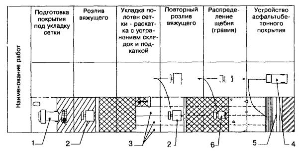 * Ровинг - пучок базальтовых комплексных нитей. 2.3. Поставка сетки на объект осуществляется в рулонах согласно указанным выше ТУ. Контроль качества и приемка сетки выполняются Заказчиком, возможно привлечение научных или других организаций, обладающих необходимым опытом работы с этим материалом и имеющих соответствующее оборудование. 2.4. Для обеспечения сцепления сетки с нижним и верхним слоями асфальтобетонного покрытия и дальнейшей совместной их работы проводится подгрунтовка с использованием эмульсий битумных дорожных по ГОСТ 18659-81 или битумов нефтяных дорожных вязких по ГОСТ 22245-90. Используемый битум должен отвечать требованиям сцепления с песком в соответствии с методикой ГОСТ 11508-74. При неудовлетворительном сцеплении битума с минеральным материалом адгезионные свойства битума должны быть улучшены путём введения добавки поверхностно-активного вещества катионного типа в соответствии с указаниями «Инструкции» ВСН 59-68. Расход битума определяется из расчета 0,8 - 1,0 л/м2. 3. Технология производства работ по армированию асфальтобетонного покрытия базальтовой сеткой3.1. Технология производства работ при строительстве и ремонте асфальтобетонного покрытия.3.1.1. Работы по устройству дорожных покрытий ведут по типовым технологическим схемам с включением отдельных операций, связанных с укладкой сетки из базальтового материала: - подготовка покрытия; - укладка и фиксация базальтовой сетки на покрытии; - устройство асфальтобетонного покрытия. 3.1.2. Работы по подготовке поверхности покрытия и укладке сетки следует производить в сухую погоду, на сухом покрытии при температуре воздуха не ниже +5°С и силе ветра не более 6 м/сек. 3.1.3. Обработку покрытия битумом (битумной эмульсией) выполняют на ширину асфальтоукладчика плюс 0,15 - 0,20 м сплошным слоем, последовательно на длину одного или двух рулонов сетки с последующим повтором, в целом на длину сменной захватки. Длину обрабатываемого битумной эмульсией (битумом) участка следует уточнять на месте с учётом производительности ведущей машины - асфальтоукладчика и в зависимости от принятой схемы организации работ. При этом целесообразно согласовать режим розлива с методикой укладки сетки и длиной рулона. В любом случае на расстоянии от асфальтоукладчика до конца уложенной сетки не должно быть движения транспортных средств. 3.1.4. Основной розлив вяжущего следует выполнять автогудронатором, чтобы обеспечить однородную обработку покрытия без образования «битумных дорожек». При обработке покрытия битумом его температура должна составлять 140 - 160°С. При обработке покрытия битумной эмульсией (катионной) ее температура может быть равна окружающей (при ее значении выше 20°С). При температуре окружающего воздуха ниже 20°С эмульсию следует подогреть до 50°С. 3.1.5. Норму расхода битума (битумной эмульсии) уточняют после проведения подготовительных работ. При наличии значительного количества не устраненных мелких дефектов (мелкие трещины шириной до 3 мм) расход принимается 1,0 л/м2 и более. При полном устранении дефектов расход может быть снижен до 0,8 л/м2. 3.1.6. Доставку сетки на участок осуществляют после проведения подготовительных работ в количестве, необходимом для выполнения суточной нормы работ. Сетка складируется на обочине таким образом, чтобы исключить ручное перемещение рулонов на знач