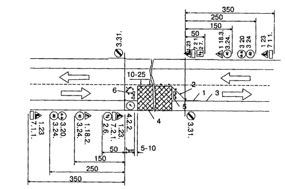 Пример размещения технических средств организации дорожного движения и ограждения места производства работ показан на рис. 6. Временные дорожные знаки, применяемые при организации движения в местах производства дорожных работ: 1.23 - Дорожные работы 1.18.2 - Сужение дороги 2.6 - Преимущество встречного движения 2.7 - Преимущество перед встречным движением 3.20 - Обгон запрещен 3.24 - Ограничение максимальной скорости 3.31 - Конец зоны всех ограничений 7.1.1 - Расстояние до объекта 7.2.1.- Зона действия 4.2.2.-Объезд препятствия слева Рис. 6. Пример решения технических средств организации движения в местах производства дорожных работ, выполняемых на половине ширины проезжей части двухполосной дороги: 1 - разметка проезжей части; 2 - направпяющие конусы; 3 - кромка проезжей части; 4 - зона дорожных работ; 5 - ограждающие барьеры; 6 - сигнальные фонари или световозвращающие элементы; 8 - ширина проезжей части, Lотг. - длина отгона ширины зоны дорожных работ; I - расстояние между конусами 3.2.6. Максимальную длину ремонтируемого участка в случае саморегулирования встречного разъезда необходимо назначать в соответствии с данными табл. 3 (ВСН 37-84, табл. 3.1). Таблица 3 Максимальная длина ремонтируемого участка