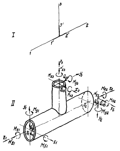 Рис 1. Нагружение тройникового соединения: I - стержневая модель; 1 - 1’, 2 - 2’, 3 - 3’ - упругие элементы; 1’ - 2’ - 3’ - абсолютно жесткая вставка; II - компоненты моментов и сил по торцам