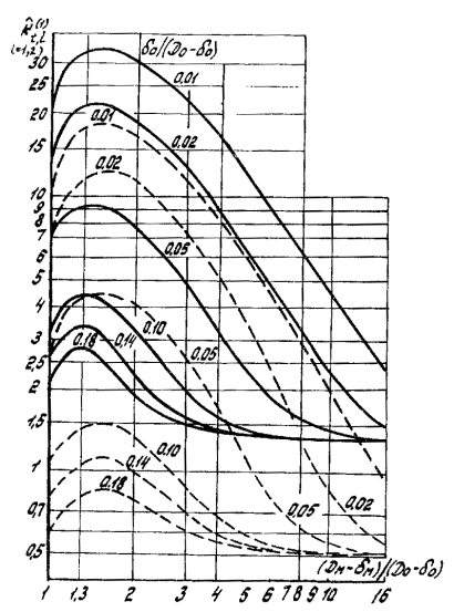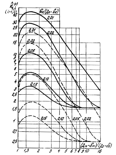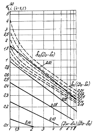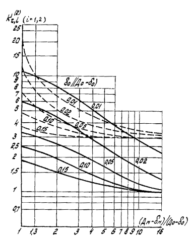 где а1 = δ0 / (Д0 - δ0), а2 = (ДМ - δМ) / (Д0 - δ0). Значения а1' и а14 являются двумя соседними известными значениями а1, т.е. а1' < а1 < а14, для которых построены кривые на рисунках. Рис. 4 - 19 подготовлены по материалам [15] приложения 2. Условные упругие эквивалентные напряжения в тройниковых соединениях должны удовлетворять условиям: