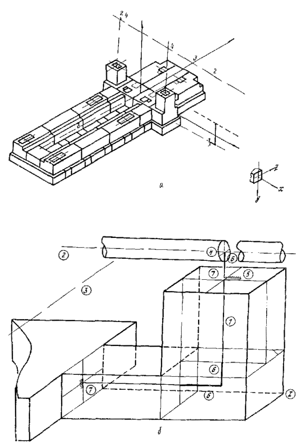 штуцера агрегата от силы Попытка решить задачу с двумя закреплениями - в точке а и в точке b при длине ab, соизмеримой с диаметром трубопровода, может привести к неточным результатам, ибо система уравнений оказывается плохо обусловленной. Функциональное назначаете креплений (опор) определяется схемой работы крепления, т.е. каким перемещениям трубопровода оно препятствует, а каким - нет. Например, в программе СТАРТ все крепления делятся на стандартные и нестандартные. К стандартным опорам относятся мертвая, направляющая и скользящая опоры. Мертвая опора препятствует любым перемещениям трубопровода. Реакция опоры имеет шесть компонентов: три момента вокруг осей X, У, и три силы вдоль этих осей (см. рис. 1). Направляющая опора препятствует перемещениям трубопровода ниже и поперек оси трубы, причем ось трубы обязательно лежит в горизонтальной плоскости (иначе опора будет нестандартной). При перемещении трубопровода вверх опора выключается из работы. Реакция опоры имеет три составляющие: вертикальную, горизонтальную силы (поперек оси трубы) и силу трения (вдоль оси трубы). Скользящая опора препятствует перемещению трубопровода вниз, а при перемещении трубопровода вверх - выключается из работы. Реакция опоры имеет две составляющие: вертикальную силу (реакция от веса) и сил трения в горизонтальной плоскости (которая представляется в виде двух составляющих по оси Х и по оси У). Предусматривается податливость крепления как стандартных, так и нестандартных. Податливость крепления - упругая характеристика крепления. Различают податливость линейную и угловую. Под линейной податливостью понимается перемещение (мм), вызываемое силой в 1 кг, под угловой - податливостью угла поворота в радианах от момента в 1 кгм. 4. На рис. 21, а, б, в, г показаны этапы построения расчетных схем деталей фундаментов под разгрузочные опоры трубопровода. На этих рисунках пунктирной линией изображена упругая часть, а сплошной линией (элементы i - j) - абсолютно жесткая часть элементов деталей фундаментов. Разгрузочные опоры под трубопровод выбираются аналогичным образом, т.е. выделяется упругая и абсолютно жесткая часть элементов конструкции (под упругими понимаются элементы, имеющие конечные значения жесткостных характеристик). Задание граничных условий конструкции тесно связано с возможностями использования различных сочетаний внешних связей, накладываемых на узлы расчетной схемы. При рациональном построении расчетной схемы возможно сокращение задания исходной информации путем уменьшения рассчитываемой части конструкции. Это достигается применением связей, которые описывают прямые и косые плоскости симметрии, цилиндрические и сферические шарниры, жесткие и подвижные заделки. На рис. 21, а, б, в, г введены следующие обозначения: 1 - деталь фундамента под разгрузочную опору; 2 - ось трубопровода, являющаяся одновременно осью патрубка нагнетателя ГПА; 3 - продольная ось установки ГПА; 4 - точка пересечения осей разгрузочной опоры и трубопровода; 5 - узел разгрузочной опоры, отражающий взаимодействие трубопровода обвязки и фундамента под разгрузочную опору; 6 -абсолютно жесткая вставка; 7 - упругая вставка, характеристики F , I, W, Wp которой равны фактическим геометрическим характеристикам моделируемого сечения. Расчетные схемы обвязочных трубопроводов для ГПА ГТ