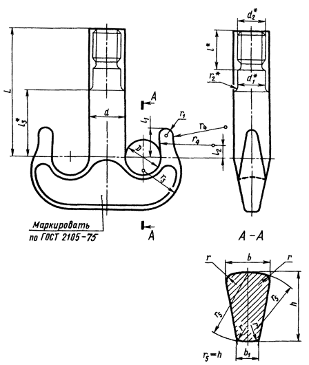Примечания: 1. Длина L заготовки крюка указана без припуска на испытания. 2. Длину L для заготовок крюков типа Б разрешается увеличивать не более чем на 100 мм для машин, у которых группа режима работы механизма подъема 6М. 3. В заготовках крюков, изготовляемых методом свободной ковки, несоосность зевов относительно общей оси для заготовок крюков с номера 1 по 5 - не более 8, с 6 по 10 - не более 14, с 11 по 14 - не более 20 мм. 4. В заготовках крюков, изготовляемых методом свободной ковки, допускается в нижней части сечения А-А радиус r не выполнять. Пример условного обозначения заготовки крюка 4 типа А: Заготовка крюка 4А ГОСТ 6628-73 2.2. Метрическая резьба - по ГОСТ 16093-81 с полем допусков 6g, трапецеидальная - по ГОСТ 9562-81. 2.3. Технические требования, методы испытаний, маркировка и транспортирование - по ГОСТ 2105-75. 2.4. Грузоподъемность крюков должна соответствовать величинам, указанным в приложении. ПРИЛОЖЕНИЕ