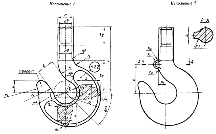 Примечания: 1. Размер r4 указан для изготовления заготовок крюков методом горячей штамповки. 2. Допускается отгиб носика крюка до 6 мм для крюков номеров 1-14 и до 10 мм для крюков номеров 15-26 в плоскости, перпендикулярной плоскости чертежа. 3. Длина L указана без припуска для проверки механических свойств металла. 4. Допускается для грузоподъемных машин и механизмов, у которых группа режима работы механизма подъема 6М, весьма тяжелого режима работы длину L заготовок крюков типа Б увеличивать на 150 мм, не более. 5. По заказу потребителя заготовки крюков номеров 1-14 допускается изготовлять без прилива. 6. Предельные отклонения размеров, не указанные в таблице, должны выполняться для заготовок крюков, изготовляемых методом горячей штамповки, - по ГОСТ 7505-89. 7. При изготовлении заготовок крюков ковкой радиусы, служащие для построения и образования конфигурации крюка, не являются сдаточными параметрами. Допуски определяются изготовителем. 8. Допускается вместо радиусов r3 и r6 прямая площадка. 9. Для размеров l, b1, А, А1 заготовок крюков, получаемых методом свободной ковки, предельные отклонения соответствуют предельным отклонениям размера D соответствующего номера заготовки. (Измененная редакция, Изм. № 1, 2). Пример условного обозначения заготовки крюка номер 10, типа А, исполнения 2: Заготовка крюка 10А-2 ГОСТ 6627-74 2.2. Технические требования, методы испытаний, маркировка и транспортирование - по ГОСТ 2105-75. 2.3. Грузоподъемность крюков должна соответствовать величинам, указанным в приложении. ПРИЛОЖЕНИЕ