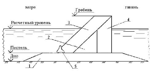 Рис. 1. Схема сооружения: 1 - каменная постель; 2 - ядро наброски; 3 - защитная наброска; 4 - экран; 5 - упорный тетрапод 1.3. Обеспеченность расчетного уровня должна приниматься не более 5 % (1 раз в 20 лет). 1.4. При определении элементов ветровых волн следует принимать обеспеченность расчетного шторма 2 % (1 раз в 50 лет), и обеспеченность волн в системе 2 %. 1.5. В качестве экрана может быть применено гравитационное или свайное сооружение любой традиционной конструкции, экономическая и технологическая эффективность которой обоснованы. Рекомендуются облегченные бетонные и железобетонные конструкции экрана ящичного или уголкового типа. 1.6. Головные и корневые участки сооружений следует проектировать, руководствуясь указаниями, разработанными для набросных оградительных сооружений традиционной конструкции. 1.7. Материалы, применяемые для строительства сооружений, должны отвечать требованиям нормативных документов. 2. РЕКОМЕНДАЦИИ ПО КОНСТРУИРОВАНИЮ СООРУЖЕНИЙ2.1. Габариты и конструкция защитной наброски2.1.1. Габариты защитной наброски определяются отметкой и шириной ее гребня, величины которых назначаются в зависимости от характеристики расчетной волны и отметки расчетного уровня воды (рис. 2). 2.1.2. Возвышение гребня наброски над расчетным уровнем воды следует принимать равным высоте волны (Zг = h). 2.1.3. Ширину гребня наброски bг следует определять по формуле