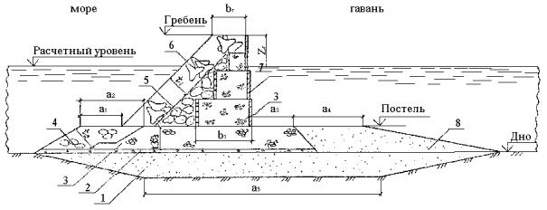 где l - длина волны. Ширина гребня не должна быть менее удвоенного размера отдельного элемента защитного слоя. Рис. 2. Схема оградительного сооружения: 1 - песчаный грунт (замена грунта); 2 - обратный фильтр (щебень, гравий); 3 - камень массой 30 - 100 кг; 4 - камень крупный массой более 800 кг; 5 - камень массой более 1500 кг; 6 - тетраподы; 7 - железобетонные массивы; 8 - песчаный грунт 2.1.4. Заложение откосов наброски их массивов (обыкновенных и фасонных) следует принимать равным m1 = 1, заложение откоса каменного ядра следует принимать равной m1 = 1,25. При специальном обосновании допускается увеличивать заложение откосов до m = 2. 2.1.5. Для ядра следует применять крупные сортированные камни. Объем каждого камня ядра наброски должен обеспечивать его устойчивость в процессе строительства при воздействии волн с обеспеченностью 10 % в режиме и 1 % в системе, но по объему не должен быть менее