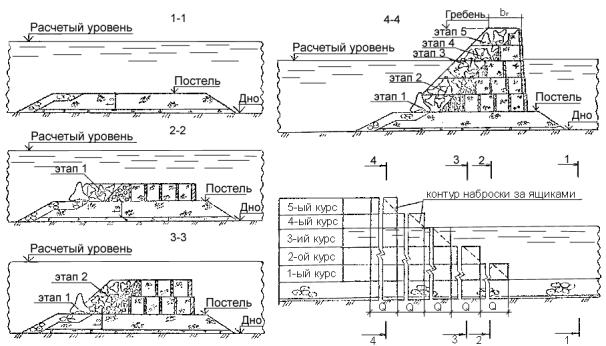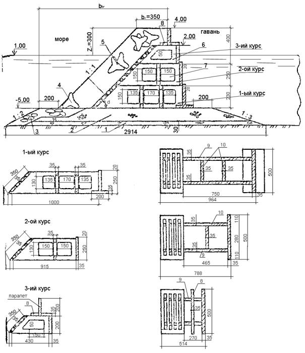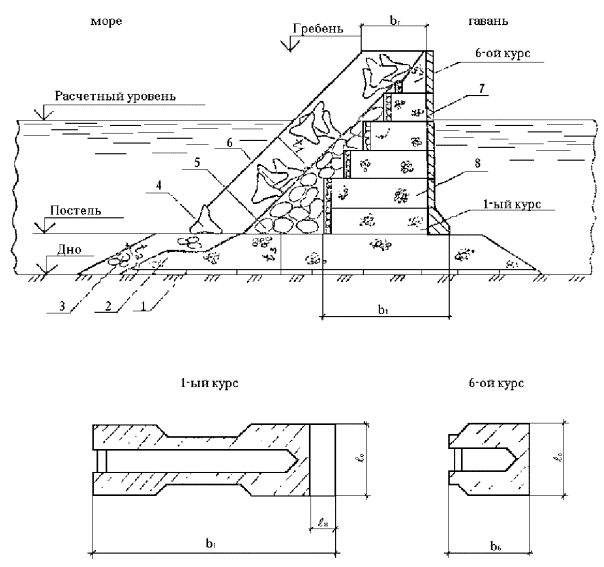 Возведение сооружения производится по курсам и в этот период конструкция неполного профиля работает, как затопленный волнолом.
