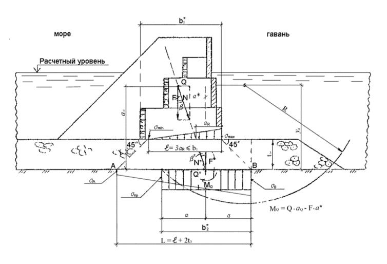 Рис. 6. Схема определения активного давления наброски на расчетную плоскость, пересекающую откос наброски. ПРИМЕЧАНИЕ. В соответствии с Приложением 6 главы СНиП на проектирование оснований гидротехнических сооружений при определении F и R для оценки устойчивости сооружения на глубинный сдвиг по круглоцилиндрическим поверхностям скольжения коэффициенты надежности по нагрузке, грунту и материалу следует принимать равным 1,0. 3.3.2. Общая устойчивость сооружения проверяется на действие наиболее неблагоприятного сочетания активных сил методом Крея-Терцаги (по круглоцилиндрическим поверхностям). При этом рассматривается возможность потери устойчивости сооружения как в сторону гавани, так и в сторону моря (рис. 7). По результатам этих расчетов устанавливаются общие габариты сооружения и необходимый объем замены грунта. 3.3.3. Устойчивость жесткого экрана проверяется на скольжение по поверхности каменной постели, на скольжение совместно с постелью по поверхности грунта, на глубинный сдвиг и на поворот вокруг ребра (рис. 8). Расчеты устойчивости экрана на скольжение по поверхности постели и по грунту совместно с постелью, а также на поворот вокруг переднего ребра следует производить по указаниям РД 31.31.27-81. 3.3.4. Расчет экрана на глубинный сдвиг производится после приведения основания жесткого экрана к фундаменту, расположенному на уровне подошвы каменной постели и имеющему ширину (см. рис. 8). Ширина приведенного фундамента определяется по формулам: