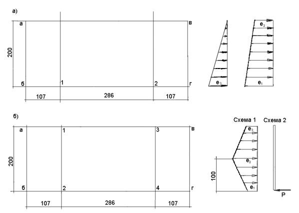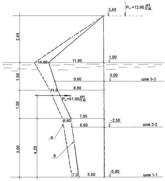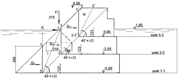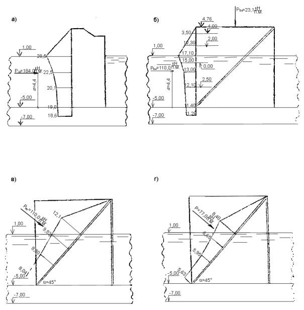 Рис. 24. Расчетные схемы вертикальных стенок массива 3-го курса: