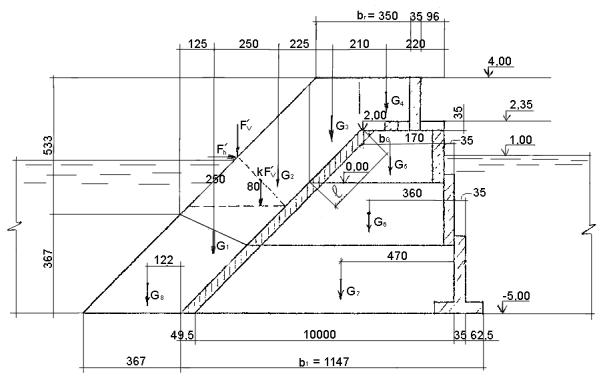 Устойчивость на опрокидывание каждого курса массивов в отдельности очевидна. Поэтому проверим дополнительно только устойчивость сооружения из трех курсов массивов без пригрузки их тетраподами (рис. 12 и 14).