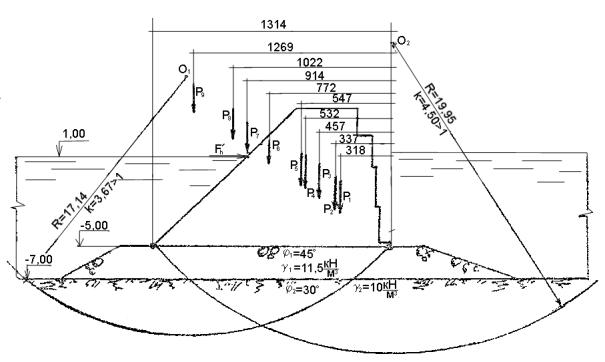 Рис. 18. Расчет общей устойчивости сооружения совместно с наброской и постелью методов Крея-Терцаги.