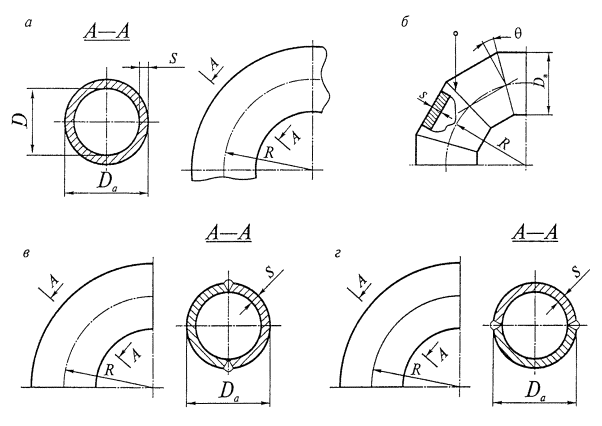 Рис. 4.1. Отводы: а - гнутый; б - секторный; в, г - штампосварной. Таблица 4.2