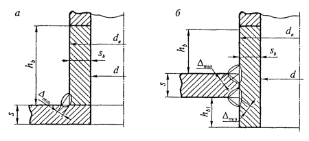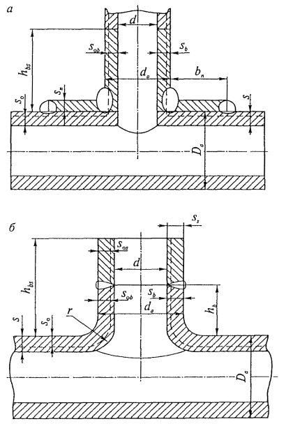 где hb - высота штуцера; sb - толщина стенки штуцера; sob - минимально допустимая толщина стенки штуцера, вычисляемая по формулам 4.12 - 4.13 при значении j = 1. Рис. 4.2. Типы сварных соединений тройников со штуцером: а - примыкающий к наружной поверхности магистрали; б - пропущенный внутрь магистрали. для пропущенных внутрь магистралей штуцеров, конструкция которых соответствует рис. 4.2, б:
