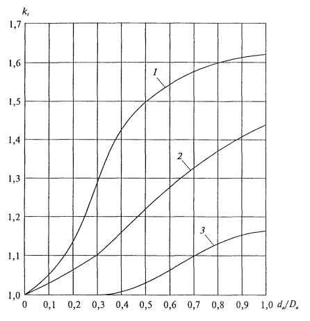 Рис. 5.2. Графики для определения коэффициентов концентрации напряжений в тройниках: 1 - для сварных тройников без усиливающих накладок; 2 - для штампованных и штампосварных тройников; 3 - для тройников с усиливающими накладками/ 5.5.7. Для сильфонных компенсаторов, полученных методом гидроформовки и линзовых компенсаторов, сваренных из двух полулинз, коэффициент концентрации напряжений рекомендуется принимать по табл. 5.5. Таблица 5.5