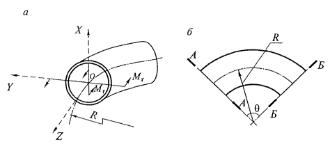 5.6.10. Напряжения в трубах определяются в соответствии с п. 5.6.2 - 5.6.9. При этом коэффициенты интенсификации принимаются i0 = ii = 1, а характеристики сечения определяются по формулам: 5.6.11. Напряжения в отводах определяются в соответствии с п. 5.6.2 - 5.6.9 для двух крайних сечений А - А и Б - Б (рис. 5.3). За расчетное эквивалентное напряжение принимается наибольшее из двух значений. Характеристики сечений W и Аp рассчитываются по формуле (5.36), а коэффициенты i0 и ii - по формулам: для гнутых, крутоизогнутых и штампосварных отводов, стыкуемых с трубами на сварке:
