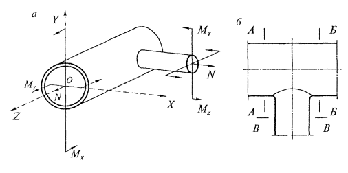 Рис. п. 1. Расчетная схема Т-образного сварного соединения трубопровода 2.2. Углы поворота в узле А (рис. п.1) от приложенных к ответвлению изгибающих моментов в плоскости соединения (Мyb) и в перпендикулярной ей плоскости (Мxb), а также от крутящего момента (Мzb) подсчитываются по формулам: