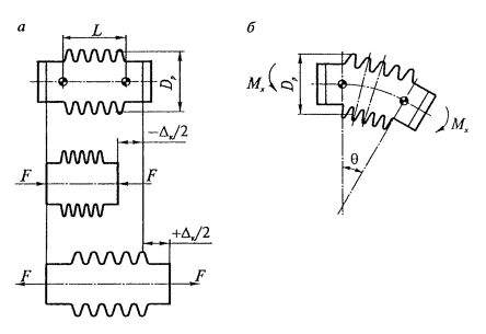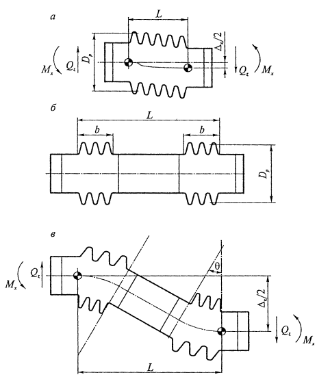 в которых sbm принимается: при расчете сварных тройников как наименьшее значение из величин sb и sb ii а при расчете штампованных и штампосварных тройников как наименьшее значение из величин ss и ss ii. 5.6.12.5. Врезки, конструкция которых соответствует рис. 4.2, а и 4.3, а, рассчитываются по формулам сварных тройников. 5.7. Напряжения в сильфонных и линзовых компенсаторах5.7.1. В тепловых сетях используются линзовые и однослойные сильфонные компенсаторы. В зависимости от характера воспринимаемых перемещений применятся осевые, угловые (поворотные) и сдвиговые компенсаторы (рис. 5.5, 5.6 и 5.7). На чертежах компенсаторов через Dк обозначена их компенсирующая способность. Ниже приводятся формулы для определения напряжений в гибких элементах указанных компенсаторов. Рис. 5.5. Гибкий элемент компенсатора. Рис. 5.6. Схема работы компенсатора: а - осевого; б - углового. Рис. 5.7. Схемы работы сдвиговых компенсаторов: а - без промежуточной вставки; б, в - с промежуточной вставкой-трубой. 5.7.2. Среднее окружное напряжение от внутреннего давления