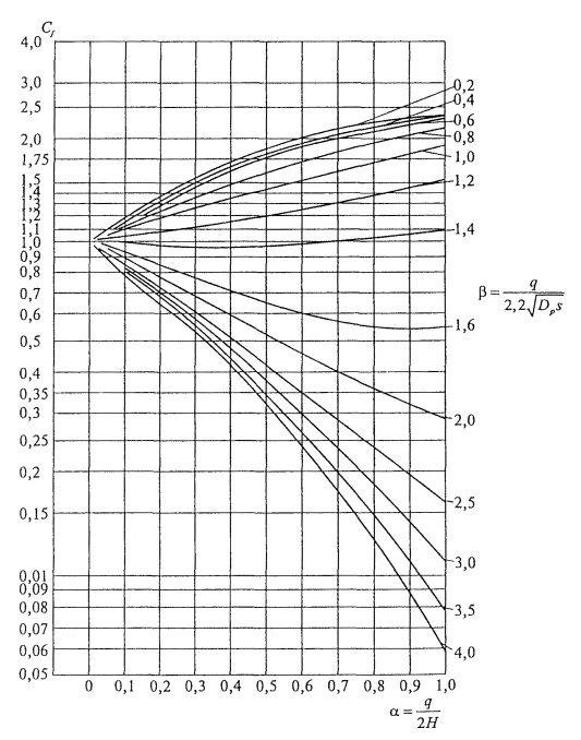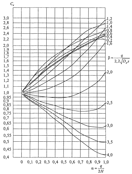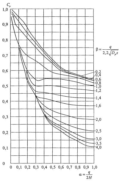 здесь Сp, Сf, Сd - коэффициенты, определяемые по графикам рис. 5.8, 5.9 и 5.10 в зависимости от безразмерных параметров a и b; Dnp - приведенное осевое перемещение, определяемое согласно п. 5.7.4, мм; n - количество гофров (линз). 5.7.4. Приведенное осевое перемещение зависит от типа компенсатора. Рис. 5.8. Графики для определения коэффициента Сf. Рис. 5.9. Графики для определения коэффициента Сp. Рис. 5.10. Графики для определения коэффициента Сd. Для осевого компенсатора Dnp = Dp, (5.58) где Dp - расчетное осевое перемещение от действия всех нагружающих факторов, кроме внутреннего давления (см. примечание 3 к табл. 5.1). Для углового (поворотного) компенсатора
