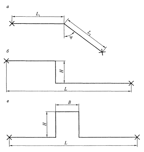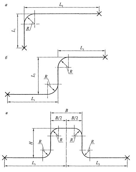 За расчетное значение следует принимать меньшее из двух L. Рис. п. 4.1. Участки бесканальной прокладки в грунте: а - с Г-образным поворотом; б - с Z-образным поворотом; в - с П-образным поворотом. где
