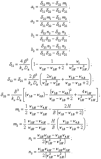 здесь n1H, n2H, ... - функции n1, n2, …, вычисляемые по формулам (п. 4.2) при значении х = Н; n1В, n2В, … - те же функции при значении х = В; 2) при Н ³ 3/b и B ³ 3/b