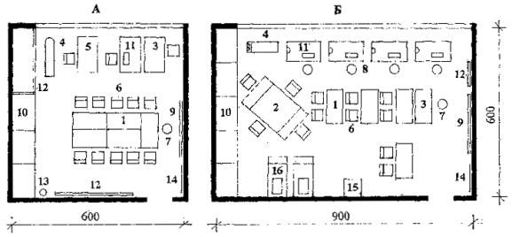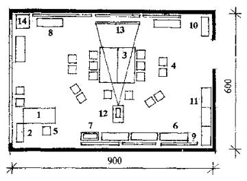 Рис. 10 Планировочная схема кружков общегуманитарного направления деятельности Экспликация оборудования: 1 - стол письменный однотумбовый; 2 - стол-приставка; 3 - стол для заседаний; 4 - стул складируемый; 5 - стул полужёсткий; 6 - банкетка полужёсткая; 7 - стол-подставка; 8 -стол-витрина; 9 - стенд настенный; 10 - шкаф (секция) с отделением для выставки; 11 - шкаф (секция) для пособий и инвентаря; 12 - подставка под проекционную аппаратуру; 13 - экран свёртывающийся; 14 - цветочница |
