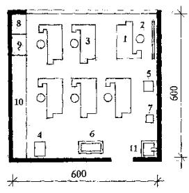 Рис. 7 Планировочная схема мастерской по обработке дерева Экспликация оборудования 1 - верстак руководителя; 2 - табурет; 3 - верстак столярный; 4 - станок сверлильный настольный; 5 - точило наждачное; 6 - станок фуговально-распиловочный; 7 - клееварка; 8 - урна для мусора; 9 - встроенный шкаф для спецодежды; 10 - шкаф-стеллаж для инструментов и материалов; 11 - раковина
