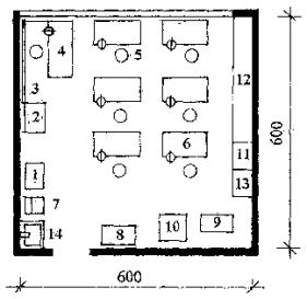 Рис. 8 Планировочная схема мастерской по обработке металла Экспликация оборудования 1 - шкаф для книг и пособий; 2 - муфельная печь; 3 -доска классная; 4 - верстак руководителя; 5 - табурет; 6 - верстак слесарный; 7 - точило наждачное; 8 - наковальня; 9 - станок токарный; 10 - станок сверлильный; 11 - встроенный шкаф для спецодежды; 12 - шкаф-стеллаж для инструментов и материалов; 13 - урна для мусора; 14 - раковина