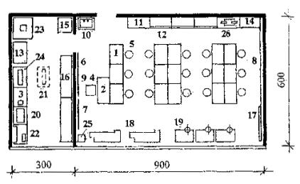 Рис. 9 Планировочная схема кружка технического моделирования Экспликация помещений: 1 - стол рабочий одноместный; 2 - стол педагога; 3 - стол-подставка под оборудование; 4 - стул поворотный; 5 - табурет лабораторный; 6 - доска меловая настенная; 7 - доска приколочная настенная; 8 - стенд настенный; 9 - экран свёртывающийся; 10 - раковина; 11 - шкаф (секция) для спецодежды; 12 - шкаф (секция) с отделением для выставки; 13 - шкаф (секция) для приборов и инвентаря; 14 - шкаф-сейф; 15 - шкаф вытяжной; 16 - стеллаж деревянный; 17 - стенд для инструментов; 18 - верстак столярный; 19 - верстак слесарный с тисками; 20 - станок настольный сверлильный; 21 - станок фуговально-распиловочный передвижной; 22 - электроточило; 23 - электроклееварка; 24 - электрокипятильник; 25 - ящик для мусора; 26 - подставка для проекционной аппаратуры передвижная