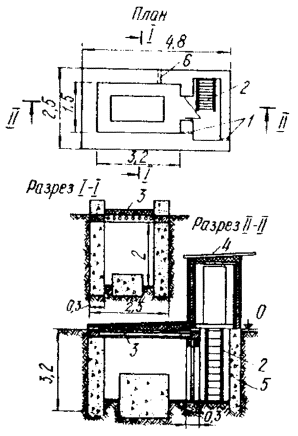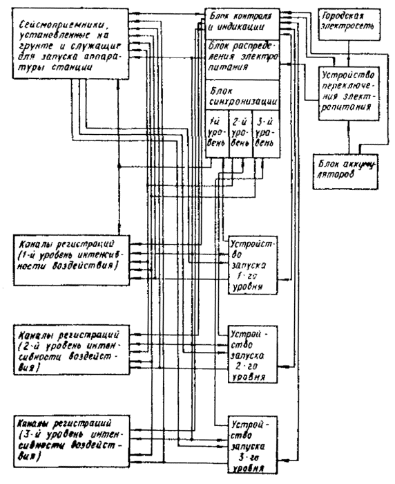 Таблица 3 2.14. Аппаратура станции ИСС работает в ждущем режиме. Включение приборов производится автоматическими пусковыми устройствами, которые в комплекте с пусковыми сейсмоприемниками позволяют производить многократную запись, обеспечивая автоматическое включение и выключение станции при каждом землетрясении. Для повышения надежности срабатывания аппаратуры рекомендуется комплектовать станции ИСС тремя пусковыми устройствами ПУ-1, соединенными параллельно, с последующей (рис. 4) логической схемой питания осциллографов необходимой для надежного выключения аппаратуры станции. Рис. 4. Логическая схема соединения трех параллельных пусковых устройств ПУ-1 (I, II, III -пусковые устройства); (1), (2) -контакты реле Рис. 5. Схема выработки синхроимпульса по всем каналам ИСС (Блок А рассчитывается из условия выработки временного импульса через ~ 0,2 с после включения осциллографов) 2.16. При использовании на станции ИСС осциллографов, не имеющих внутренних источников временных меток, рекомендуется для этих целей применять электро-контактные часы (МЧ-62). На станциях ИСС должно быть предусмотрено устройство, вырабатывающее после запуска станции единый временной дешифрующий (синхронизирующий) импульс, поступающий на все каналы записей, отведенные для временных меток. Электрическая схема подобного устройства представлена на рис. 5. Измерительный пункт и каналы связи 2.17. Измерительный пункт представляет собой место непосредственного расположения сейсмоприемников на конструкции здания или грунте. В измерительных пунктах на конструкциях здания устанавливаются сейсмоприемники типа С-5-С, ВБП, ОСП-2М, ССР3-М, АС3 и др. Измерительные пункты на грунте кроме вышеописанных сейсмоприемников оснащаются многомаятниковыми сейсмометрами типа ИГИС (АИС), а также сейсмоприемниками СБМ. 2.18. Эксплуатационный режим измерительного пункта определяется в соответствии с паспортными данными по условиям эксплуатации установленных в нем сейсмоизмерительных приборов. 2.19. В измерительных пунктах, расположенных на элементах несущих конструкций зданий, сейсмоприемники надежно крепятся в соответствующей плоскости к конструкциям анкерными болтами с помощью станин, хомутов, переходных кронштейнов (приложение 1). После установки приборы закрываются чехлами, защищающими их от механических повреждений в отсутствие землетрясений. При установке приборов особое внимание следует обратить на то, чтобы ограждающие чехлы и устройства крепления не оказывали влияния на производимую регистрацию. Вблизи измерительного пункта предусматривается источник света (осветительная лампа, розетка электросети и т.п.) для осуществления крепления приборов и их ремонта. 2.20. Измерительный пункт на грунте представляет собой помещение площадью не менее 5м2 с хорошей гидроизоляцией стен, потолка и входного люка или двери. Внутри пункта обязательна принудительная вентиляция и наличие источника света. Приборы устанавливаются на бетонные постаменты высотой 40-60 см над уровнем пола. Постаменты заглубляются ниже уровня промерзания грунтов. Конструктивная схема рекомендуемого измерительного пункта на грунте приведена на рис. 6. 2.21. Установку сейсмоприемников в измерительных пунктах рекомендуется осуществлять таким образом, чтобы производилась регистрация движения конструкций зда