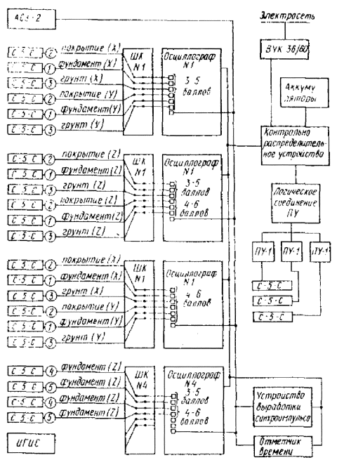 Каналы регистрации 3.5. Для регистрации движения конструкций здания и грунта на станциях инженерно-сейсмометрической службы используются различные сейсмометрические каналы гальванометрической регистрации, состоящие из цепочки: сейсмоприемник, гальванометр, осциллограф. В табл. 9 приведены рекомендуемые сочетания сейсмоприемников и гальванометров, регистрирующие тот или иной параметр движения. В табл. 10 даны ориентировочные масштабы увеличения гальванометрических каналов при некоторых сочетаниях сейсмоприемников и гальванометров, соединенных через шунтовые коробки ШК-2 при b=1 (общее сопротивление цепи датчиков и ШК-2 на входе гальванометров равно 100 Ом) для осциллографов с оптическим плечом-рычагом 0,3 м. В осциллографах с иным оптическим плечом-рычагом увеличение каналов будет пропорционально отношению фактического оптического рычага к принятому для данной табл. 10. 3.6. Рекомендуется текущую отметку времени и единый дешифрующий импульс (п. 2.15 настоящих рекомендаций) подавать на дополнительно установленный в каждом из осциллографов гальванометр, трек от которого на фотоносителе одновременно служит для последующего устранения искажений, вызванных случайными движениями фотоносителя в кассетах. Скорость протяжки фотобумаги в осциллографах рекомендуется принимать до 40 мм/с. 3.7. В целях последующего устранения искажений записей, возникающих в процессе регистрации, необходимо произвести в течение приблизительно 2 с запись с отключенными сейсмоприемниками (при зашунтированных гальванометрах) после регистрации сейсмического воздействия. Таблица 9 Таблица 10 *Запись осуществляется на двух уровнях чувствительности при подключении сейсмометра к двум гальванометрам. (Пример. Осуществляется регистрация вдоль оси Ю-С. Элемент конструкции, на котором установлен прибор, движется вдоль этой оси по направлению с Ю на С. На фотоносителе такому направлению движения соответствует движение светового луча вниз от начального положения). Схема обозначения направлений движения вдоль осей представлена на рис. 9. Рис. 9. Схема обозначения направлений движения вдоль продольной оси (х-х) и поперечной оси (у-у) здания для согласования с направлениями отклонения светового блика на фотоносителе xс - направление вдоль оси х-х к северу, ув - направление вдоль оси у-у к востоку, углы a1<a2; выбор хв и ув осуществляется по направлению движения часовой стрелки. 3.9. В ждущем режиме, а также во время землетрясений интенсивностью 3-5 баллов, электропитание станции рекомендуется осуществлять от городской электросети. При землетрясениях большей интенсивности электропитание должно автоматически переключаться на автономное аккумуляторное энергоснабжение. Автоматическое переключение электропитания должно быть предусмотрено и на случай временного прекращения централизованного электроснабжения. На рис. 10 представлена рекомендуемая схема описанного устройства. Резистором R рекомендуется устанавливать ток подзарядки аккумуляторов равный 100-200 мА (кипение электролита в аккумуляторах недопустимо). Рис. 10. Схема блока питания станции ИСС 3.10. Тарировка сейсмометрических каналов с гальванометрической регистрацией может производиться аналитически или на тарировочной платформе (приложение 2). Рекомендуется организация импульсной тарировки, которая не т