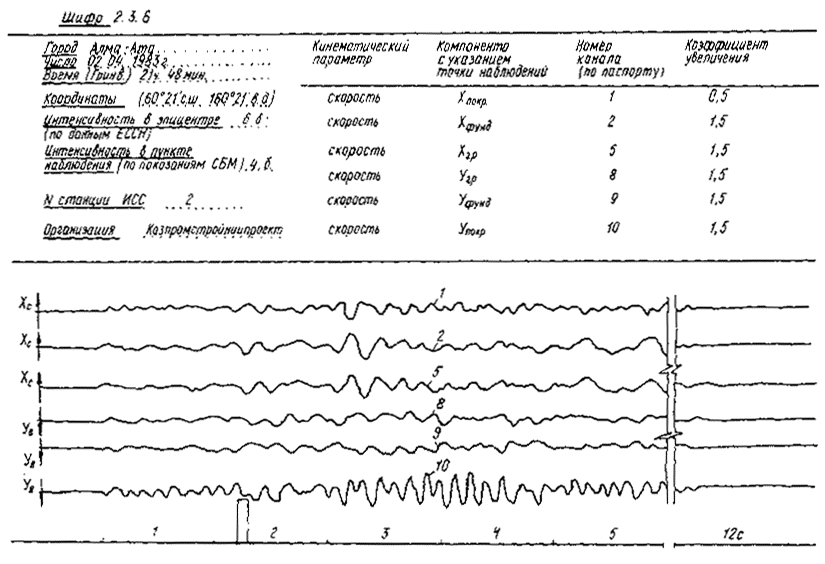 Требования, предъявляемые к записям, получаемым на станциях ИСС: - наличие загрубленного (свободного от записи) канала, служащего для устранения искажений, возникающих за счет случайных движений фотоносителя в кассетах, на который подаются текущие временные метки и единый дешифрующий импульс; - наличие отрезка нулевой линии после конца записей сигнала для каждого трека; - указание соответствия направления движения элемента конструкции здания или грунта в точке регистрации направлению записи на фотобумаге (смотри п. 3.8 настоящих рекомендаций и рис. 9 и 12); - указание места регистрации; - наличие шифра лент в соответствии с примечанием табл. 15; - указание времени и координат землетрясения; - указание интенсивности землетрясения в эпицентре (по данным ЕСНН) и в пункте регистрации по показаниям приборов СБМ или ИГИС; - наличие номера станции; - указание коэффициента увеличения канала (отношения значений величин в мм на записи к действительным значениям в мм, мм/с, мм/с2, соответственно для смещений скоростей и ускорений); - указание зарегистрированного кинематического параметра; - указание номера канала регистрации (по паспорту станции); - указание регистрируемой компоненты и точки регистрации. Рекомендуемый образец оформления записи приведен на рис. 12. Таблица 12