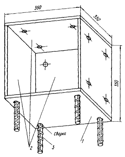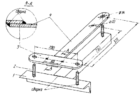 3.24. паспорт станции ИСС, характеризующий место ее расположения, здание на котором она организована, порядок расположения измерительных пунктов и их состав оформляются в соответствии с примером приложения 3 и направляются в Центр сейсмостойкости ЦНИИСК. Паспорт должен содержать титульный лист по приведенной в приложении форме, заверенный подписями и печатями, и четыре раздела описания станции ИСС, необходимые для использования получаемой на этой станции информации. Характеристика здания (сооружения) включает: - наименование объекта; - проект; - общие габариты сооружения (длина, ширина, высота); - количество этажей; - количество секций; - ориентация продольной оси здания (сооружения) относительно оси С-Ю; - наличие подвалов, полуподвалов; - характеристика несущих конструкций а) фундаменты; б) цоколь; в) стены или каркас (расстояния между продольными и поперечными осями стен, ширина простенков, ширина проемов, выступы (изломы) стен в плане и др.); г) перекрытия; д) перемычки; е) лестницы; - характеристика не несущих конструкций а) ограждающие конструкции; б) перегородки; в) веранды; г) крыша; д) элементы здания, выступающие из плоскости стен (карнизы, парапеты, фронтоны, колоннады и др.); - характеристика антисейсмических мероприятий; - динамические параметры здания (периоды собственных колебаний и логарифмические декременты колебаний вдоль главных осей); - общий вид, план типового этажа, разрез здания, генплан. Инженерно-геологические условия площадки строительства включают: - сейсмичность площадки строительства по данным микросейсморайонирования (в отсутствии данных микросейсморайонирования по СНиП); - грунтовые условия строительства (просадочные, непросадочные грунты); - влажность и пористость грунтов; - противопросадочные мероприятия; - геологический разрез площадки строительства и физико-механические свойства верхних слоев. Схема размещения измерительных пунктов на здании (сооружении) с указанием их номеров, а также место нахождения регистрационного помещения Техническое оснащение станции включает данные по: - составу станции; - распределению сейсмометрических каналов по измерительным пунктам; - нестандартному оборудованию станции. В конце паспорта допускается примечание, в котором отражаются особенности станции, не вошедшие в предыдущее разделы, и помещаются сведения об изменениях, производимых на станции в процессе эксплуатации. Приложение 1ПЕРЕХОДНЫЕ КРОНШТЕЙНЫ ДЛЯ КРЕПЛЕНИЯ СЕЙСМОПРИЕМНИКОВ В ИЗМЕРИТЕЛЬНЫХ ПУНКТАХА) Переходный кронштейн для крепления сейсмоприемника С-5-С к бетонному постаменту (рис. 13). Рис. 13. Переходный кронштейн для крепления С-5-С к постаменту Закладная деталь (1), состоящая из сваренных стальных уголков 30´30 мм, к которым приварено 3 болта М10 (2) длиной не более 100 мм, погружается в бетон постамента при заливке на столько, чтобы над бетоном оставалась свободная часть болтов (2) длиной порядка 40-50 мм. Переходный кронштейн состоит из 2-х частей (3) и (4), сваренных между собой. Он выполняется из полосовой стали 25´5 мм. В кронштейне (3, 4) высверливается три отверстия диаметром 10 мм для крепления к нему сейсмоприемника С-5-С, а также три отверстия диаметром 14 мм для крепления посредством болтов на постамент собранной конструкции (2). Б) Переходный кронштейн для крепления сейсмоприемника С-5-С к стене или колонне (рис. 