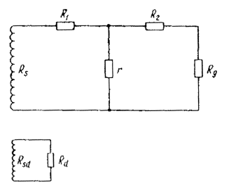 здесь ws и wg - соответственно парциальные частоты сейсмометра и гальванометра. Аналитическая тарировка* В общем виде электрическая схема канала с гальванометрической регистрацией представлена на рис. 16, где введены следующие обозначения: Rs - внутреннее сопротивление рабочей катушки сейсмометра; R1 и R2 - добавочные сопротивления; r -шунтирующее сопротивление; Rg - внутреннее сопротивление гальванометра; Rsd и Rd - внутреннее и внешнее сопротивление катушки затухания сейсмометра. Рис. 16. Электрическая схема соединения сейсмометра и гальванометра в регистрационном канале станции ИСС Для расчета коэффициента увеличения, амплитудно- и фазово-частотных характеристик по приведенным формулам требуются следующие параметры. Сейсмометра: а. Технические данные (по паспорту) - Ts - период маятника; Rs - сопротивление катушки маятника; Dso - воздушное затухание маятника; ls - приведенная длина маятника; Кs - момент инерции маятника; Ss - чувствительность сейсмометра. б. Расчетные данные -