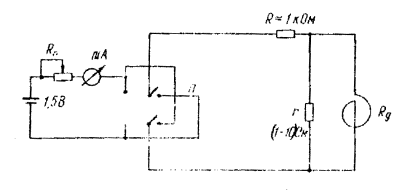 Для определения Sg и Рg собирается схема, приведенная на рис. 17. Реостатом Rn подбирается такой ток, при котором световой блик отклоняется на 20-30 мм по матовому стеклу юстировочной рамки, и после изменения полярности тока (тумблер П) измеряется отклонение светового блика. Для повышения точности отсчетов этот процесс можно записать на фотобумагу. Sg и Рg определяются по формулам Рис. 17. Электрическая схема для определения чувствительности гальванометра