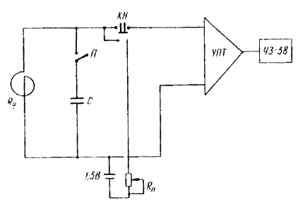 где y - отклонение светового блика в мм; R, r - сопротивление в Ом; Rg - сопротивление гальванометра в Ом; i - ток через микроамперметр в А; А - расстояние от зеркальца гальванометра до стекла юстировочной рамки или фотобумаги в м. Рис. 18. Электрическая схема для определения коэффициента электромагнитного затухания гальванометра с записью на фотобумаге Для определения ag собирается схема, приведенная на рис. 18. На регистрирующем осциллографе устанавливается скорость протяжки порядка 160 мм/с для гальванометров с частотой » 120 Гц и 40 мм/с для гальванометров с частотой » 10 Гц. Кнопкой КН подается импульс на гальванометр, и записываются его свободные колебания. За - тем тумблером П параллельно гальванометру подключается конденсатор С известной емкости (емкость конденсатора подбирается такая, чтобы частота гальванометра уменьшилась вдвое), и делается аналогичная запись. После фотообработки определяются периоды Тo без конденсатора и Ts с подключенным конденсатором; ag рассчитывается по формуле
