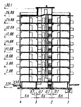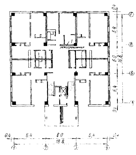 Характеристика здания - 9-этажный жилой дом (железобетонный каркас) - проект индивидуальный № 1-17 274/64 пл 1970г. - общие габариты здания: длина - 18,8 м ширина - 18 м высота - 23,8 м число этажей - 9 ориентация продольной оси относительно С-Ю - 13° - полуподвал - характеристика несущих конструкций: а) фундаменты монолитные в виде железобетонных лент (бетон М 100), на которые опираются стойки каркаса; глубина заложения 1,09-2,75; б) цоколь - бутобетонный, из бетона М 100, армированный вертикальными стержнями по 4 (Æ 12) через 150 см; в) железобетонный каркас разработан в сборных конструкциях в виде крестовин и ригелей; особенностью каркаса являются стыки; стыки ригеля с колонной и колонны с колонной осуществлены электрошлаковой сваркой стержней арматуры на металлической форме в местах, приближенных к нулевым моментам; в первом этаже железобетонный каркас выполнен монолитным с сечением колонн 60´60 см, несущих ригелей 60´65 см и связевых - 60´50 см; г) перекрытия представляют собой сборные железобетонные круглопустотные панели длиной 586 см, замоноличенные в железобетонные монолитные обвязки, связанные со сборными ригелями через выпуски арматуры из последних; д) лестницы из сборных железобетонных ступеней по металлическим косоурам с креплением ступеней на сварке закладных деталей; косоуры обтянуты металлической сеткой и оштукатурены цементным раствором толщиной 2 см; - характеристика ненесущих конструкций: а) ограждающие конструкции - навесные керамзитобетонные (М 50, бетон М 100) панели толщиной 24 см (объемный вес 1000 кг/м3), армированные арматурными каркасами (связанными) Æ12А-1 (каркас сборный индивидуальный); расстояния между продольными и поперечными осями стен соответственно 18980 и 18800 мм; Рис. 20. Общий вид здания Рис. 21. План типового этажа 1 - регистрационное помещение здания станции ИСС б) перегородки - гипсобетонные, прокатного изготовления, толщиной 8 м в лестничной клетке - железобетонные, - толщиной 14 см. в) кровля - рулонная, плоская с внутренним водостоком; - характеристика антисейсмических мероприятий; армирование стен цоколя выполнено сварными сетками из арматуры класса А-III; по верху стен цоколя уложен монолитный антисейсмический пояс, сваренный в комплексную конcтрукцию с фундаментными лентами, стойками каркаса и вертикальным армированием стен цоколя; швы замоноличивания между плитами перекрытий, армированы каркасами из стали Æ 12 и Æ 6 А-1 (бетон М 300 мелкой фракции); - динамические параметры здания; период собственных колебаний в продольном и поперечном направлениях - 0,46 с; декремент колебаний здания в продольном и поперечном направлениях - 0,117; - общий вид здания, план типового этажа и разрез здания, а также генплан застройки представлены соответственно на рис. 20, 21, 22, 23. Риc. 22. Разрез здания Рис. 23. Генеральный план расположения станции ИСС: 1 - здание станции; 2 - крупнопанельный 5-этажный жилой дом; 3 - одноэтажное кирпичное здание; 4 - крупнопанельное 3-этажное здание школы Инженерно-геологические условия площадки строительства - сейсмичность площадки 9 баллов; - непросадочные грунты; - влажность - 20,8%, коэффициент пористости - 0,7; - геолого-литологическое строение площадки строительства представлено на рис. 24; физико-механические свойства слоев приведены в табл. 17; грунты имеют горизонтальное залегание. Рис. 24. Геолого-литологическое строение площадки строитель