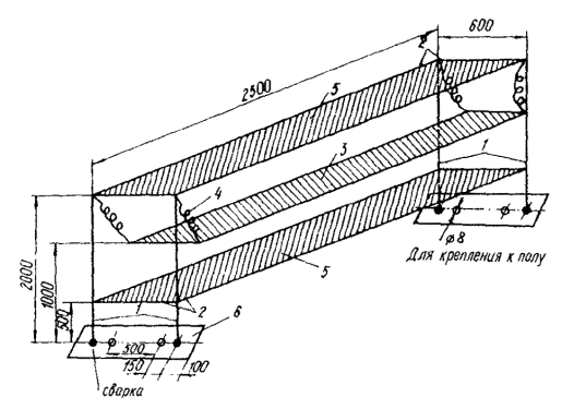 Нестандартное оборудование станции - Устройство защиты аппаратуры от сейсмических воздействий Устройство представляет собой специальную сварную металлическую раму с гибкой подвеской на ней платформы, на которой устанавливаются осциллографы и пусковое устройство. В качестве элементов подвески используются резиновые пружины. На рис. 26 приведен чертеж устройства, и даны его размеры. Рис. 26. Устройство защиты осциллографов от сейсмических воздействий Каркас устройства сварен из стального уголка 63´63´6 (1), 32´32´4 (2). Осциллографы установлены на подвесной площадке (3). Площадка подвешена на четырех пружинах (4), имеющих в нагруженном состоянии длину 1 м. Шунтовые коробки укреплены на плите (5). Для крепления к полу приварены стальные пластины (6). - Автопусковое устройство станции На станции используется модернизированное автопусковое устройство, схема которого представлена на рис. 27. СОДЕРЖАНИЕ