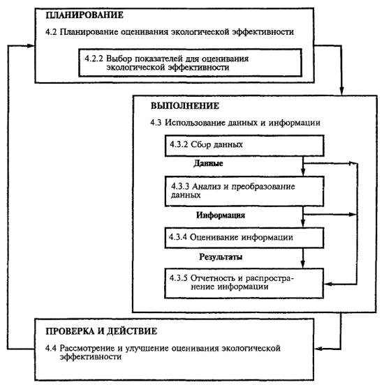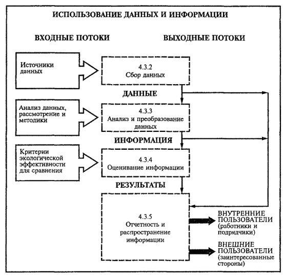 4.3 Использование данных и информации (стадия - выполнение)4.3.1 Общие положения На рисунке 4 приведена последовательность использования данных и информации для оценки экологической эффективности. 4.3.2 Сбор данных Организация должна регулярно собирать исходные данные для расчета значений выбранных показателей ОЭЭ. Данные собирают систематически из соответствующих источников с частотой, соответствующей планируемой ОЭЭ. Процедуры сбора данных должны обеспечивать их достоверность, что зависит от таких факторов, как доступность, адекватность, научная и статистическая значимость и проверяемость. Сбор данных должен сопровождаться контролем их качества и соответствия, которые бы гарантировали, что получаемые данные по типу и качеству подходят для использования при ОЭЭ. Сбор данных должен включать соответствующие процедуры идентификации, ввода, хранения, выборки и предоставления данных и информации. Организация может использовать собственные данные или данные из следующих источников: - мониторинг и измерения; - интервью и наблюдения; - отчеты надзорных органов; - инвентаризационные и производственные записи (протоколы); - финансовые и бухгалтерские записи; - записи о закупках; - отчеты по экологической экспертизе, аудиту или оцениванию; - записи по экологическому обучению; - научные отчеты и исследования; - правительственные органы, академические институты и неправительственные организации; - поставщики и субподрядчики; - потребители, продавцы и заинтересованные стороны; - профессиональные ассоциации. Рисунок 4 - Схема использования данных и информации 4.3.3 Анализ и преобразование данных Собранные данные должны быть проанализированы и преобразованы в информацию, описывающую экологическую эффективность организации в виде показателей ОЭЭ. Чтобы избежать необъективности результатов, должны быть проанализированы все относящиеся к делу и достоверные собранные данные. Анализ данных может охватывать качество данных, их значимость, адекватность и полноту, необходимые для получения надежной информации. Информация об экологической эффективности организации может быть получена с использованием расчетов, экспертных оценок, статистических методов и/или графических средств, путем индексирования (использования относительных значений), агрегирования или взвешивания. 4.3.4 Оценивание информации Информацию, полученную в результате анализа данных, выраженную в терминах ПЭЭ и возможно ПСОС, следует сравнивать с критериями экологической эффективности организации. Такое сравнение может указывать на улучшение или ухудшение экологической эффективности. Результаты этого сравнения показывают, почему достигнуты или не достигнуты критерии экологической эффективности. Информация об экологической эффективности организации и результаты сравнения должны быть представлены в виде отчета руководству, чтобы поддержать соответствующие действия руководства по улучшению или поддержанию соответствующего уровня экологической эффективности. 4.3.5 Отчетность и распространение информации 4.3.5.1 Основные положения Информация об экологической эффективности организации может быть представлена в виде отчета или передана заинтересованным сторонам внутри или вне организации, в зависимости от оценки руководством потребностей в ее распространен