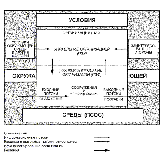 Региональные, национальные и глобальные показатели, относящиеся к экологической эффективности или устойчивому развитию, разрабатывают правительственные органы, неправительственные организации и научно-исследовательские институты. При выборе показателей ОЭЭ и сборе соответствующих данных организации могут рассматривать показатели, разработанные такими организациями, и обеспечивать информационную совместимость с ними. В контексте ОЭЭ управление организацией включает в себя экологическую политику, людей, планирование деятельности, практические действия и процедуры на всех уровнях организации, так же как решения и действия, связанные с экологическими аспектами организации. Усилия и решения, предпринимаемые руководством организации, могут влиять на характеристики функционирования организации и взаимодействовать с общей экологической эффективностью организации (рисунок 2). ПЭУ должны предусматривать информацию о способности организации и предпринимаемых усилиях в такой управленческой деятельности, как обучение, выполнение требований законодательства, обеспечение ресурсами и их эффективное использование, регулирование затрат на управление окружающей средой, обеспечение сбыта, разработки продукции, документации или проведение корректирующих действий, которые влияют или могут повлиять на экологическую эффективность организации. ПЭУ должны помогать усилиям руководства, решениям и действиям по улучшению экологической эффективности. Например, ПЭУ могут быть использованы для отслеживания: - внедрения и эффективности различных программ управления окружающей средой; - действий руководства, влияющих на экологическую эффективность организации и, возможно, состояние окружающей среды; - особо важных усилий для успеха управления окружающей средой организации; - способности управления окружающей средой организации, включая гибкость реагирования на изменения условий, связанных с конкретными целями, эффективной координацией, или способности решать проблемы; - соответствия законодательным и нормативным требованиям, соответствия другим требованиям, которым должна удовлетворять организация; - финансовых затрат и выгод. В дополнение к этому ПЭУ позволяют: - предсказать изменения эффективности; - идентифицировать причины, когда фактическая эффективность превышает, или не достигает соответствующих критериев экологической эффективности; - идентифицировать возможности предупреждающих действий. Примеры ПЭУ приведены в А.4.2.2. ПЭФ должны предоставлять руководству информацию об экологической эффективности функционирования организации. ПЭФ охватывают: - входные материальные потоки (например обработанные, восстановленные, повторно используемые или исходные сырьевые материалы, природные ресурсы), энергию и услуги; - обеспечение поставок для функционирования организации; - проектирование, монтаж, функционирование (включая аварийные ситуации и отклонения в работе) и техническое обслуживание сооружений и оборудования организации; - выходные потоки: продукцию (например основную продукцию, полуфабрикаты, восстановленные и повторно используемые материалы), услуги, отходы (твердые, жидкие, опасные, безопасные, пригодные к восстановлению, повторному использованию), выбросы/сбросы (выбросы в атмосферу, сбросы в воду